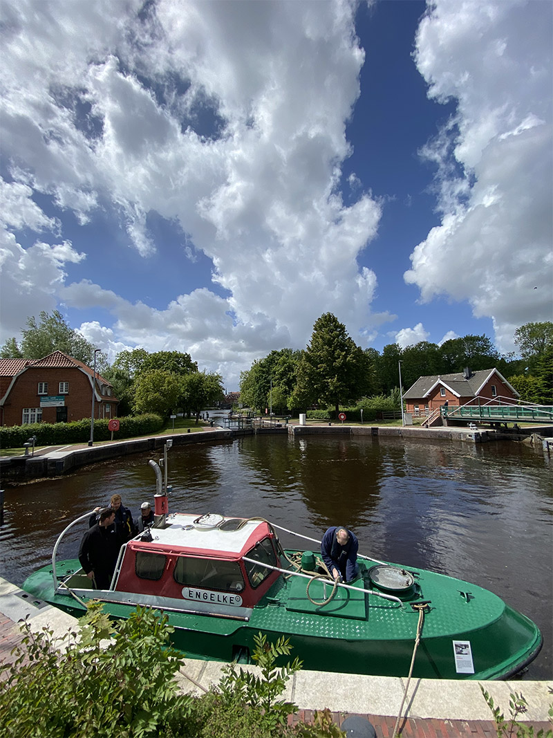 Das gab es noch nie: Zum ersten Mal im Leben unseres Tochterbootes war es in der ehrwürdigen Kesselschleuse in Emden. Unsere "alte Dame" muss gelegentlich gefahren werden - wie bei einem Oldtimer, damit die Maschine weiterhin intakt bleibt. Im Stadtgraben trauten einigen Emdern ihren Augen nicht, als sie unser Tochterboot dort fahren sahen. Denn normalerweise liegt es in der Heckwanne der Georg Breusing.