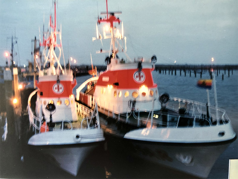 Es wäre so ein schönes Bild gewesen, wenn die Otto Schülke - der Norderneyer Kollegen - zum Matjesfest neben uns festgemacht hätte. Leider kam es anders als man dachte: Die Maschine des Rettungskreuzers war für den Trip nach Emden nicht gerüstet. Trotzdem haben wir uns gefreut, dass die Mannschaft der Schülke auf einen Plausch zu uns an Bord kam. Aufgeschoben ist nicht aufgehoben. Bald werden sich die Schiffe treffen - entweder in Emden oder auf Norderney - wie in alten Zeiten (siehe Foto, als die zwei Einheiten noch im Dienst waren).
