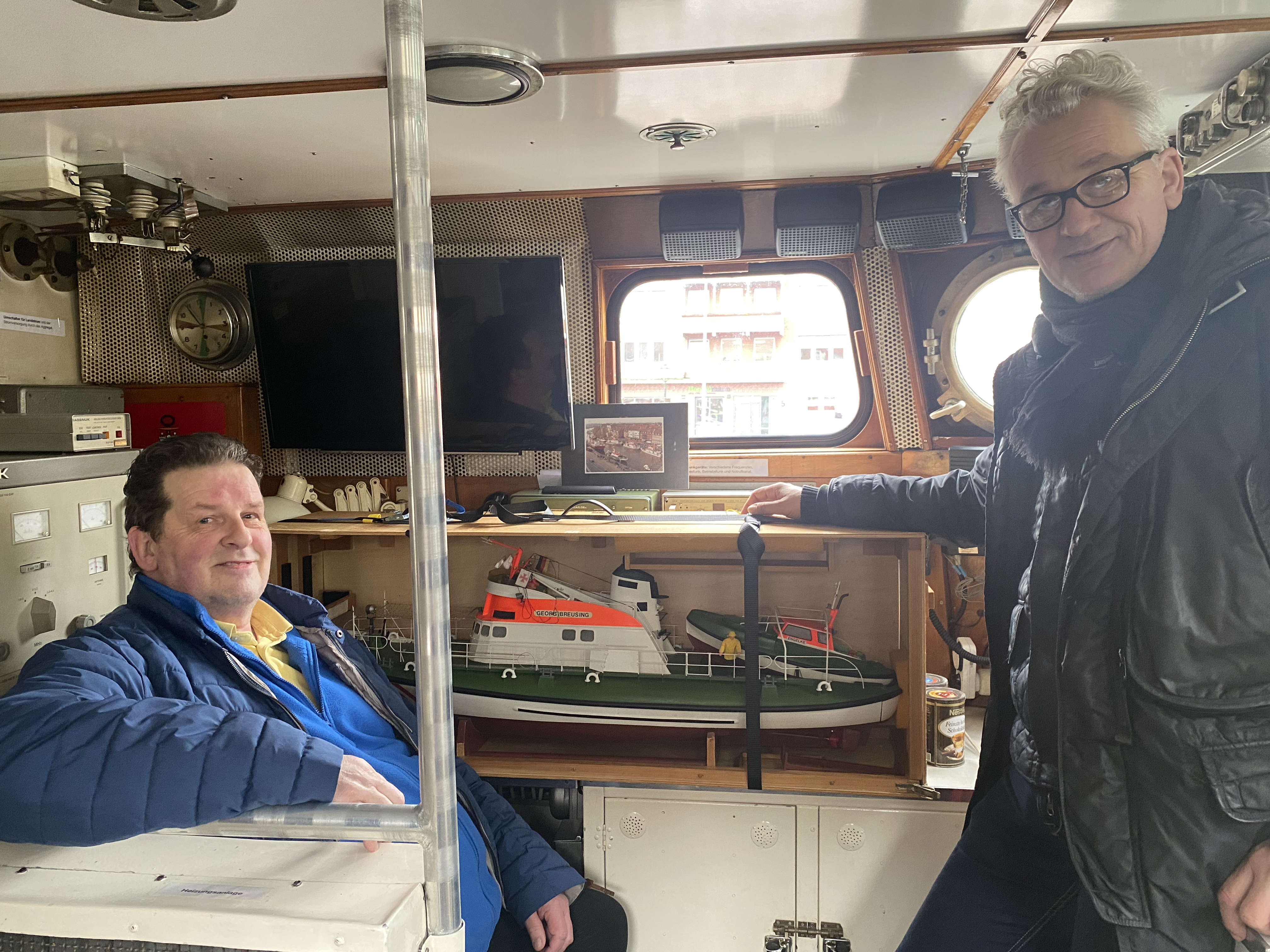 Johann Martens aus Hamburg kam extra zu uns, um uns Fotos von der Verladung des ehemaligen Rettungskreuzers "Hermann Ritter" (war in den 80ern auch mal in Emden zum Stadtfest) zu überbringen. Martens war über Jahrzehnte sogenannter "Stauervize" (Chef einer Verladungscrew) bei einem Hamburger Umschlagsbetrieb. Er verlud Ende der 80er einen der drei 44-Meter Rettungskreuzer Huckepack auf ein Schiff, dass den Kreuzer nach China brachte (mittlerweile ist die Ritter verschrottet). Und sowieso hatte der rüstige Rentner viele Geschichten über die Seefahrt in seinem Gepäck.