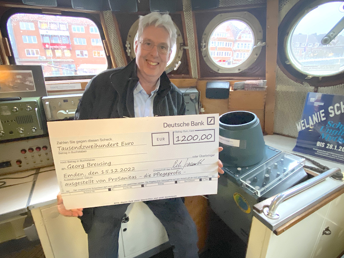 Bereits im dritten Jahr hat uns Peter Groeneveld, von der "Ambulanten Kranken und Seniorenpflege Pro Sanitas" aus Emden, einen Spendenscheck in Höhe von 1200 Euro überreicht. Wir freuen uns sehr über diesen großzügigen Betrag. Das Geld fließt in die Erhaltung des Museumsschiffes ein.